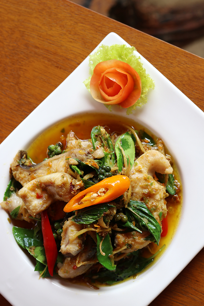 เริ่มด้วย ‘ปลาคังผัดฉ่า’ ปลาสดๆจากแก่งกระจาน ชิ้นใหญ่ ผัดมาแบบหอมกลิ่นสมุนไพรสุดๆ
