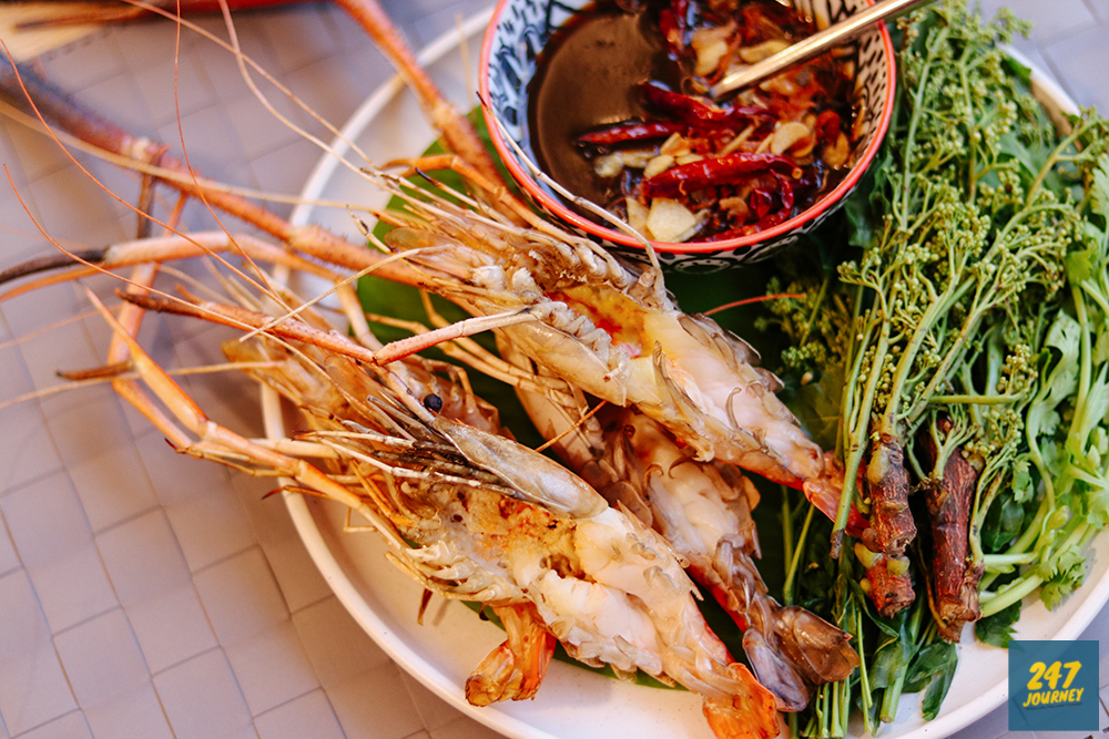 โรยด้วยหอมเจียวและพริกแห้ง เวลาทานก็ตักราดบนเนื้อกุ้งเผา แนมด้วยสะเดาที่มีรสขม
